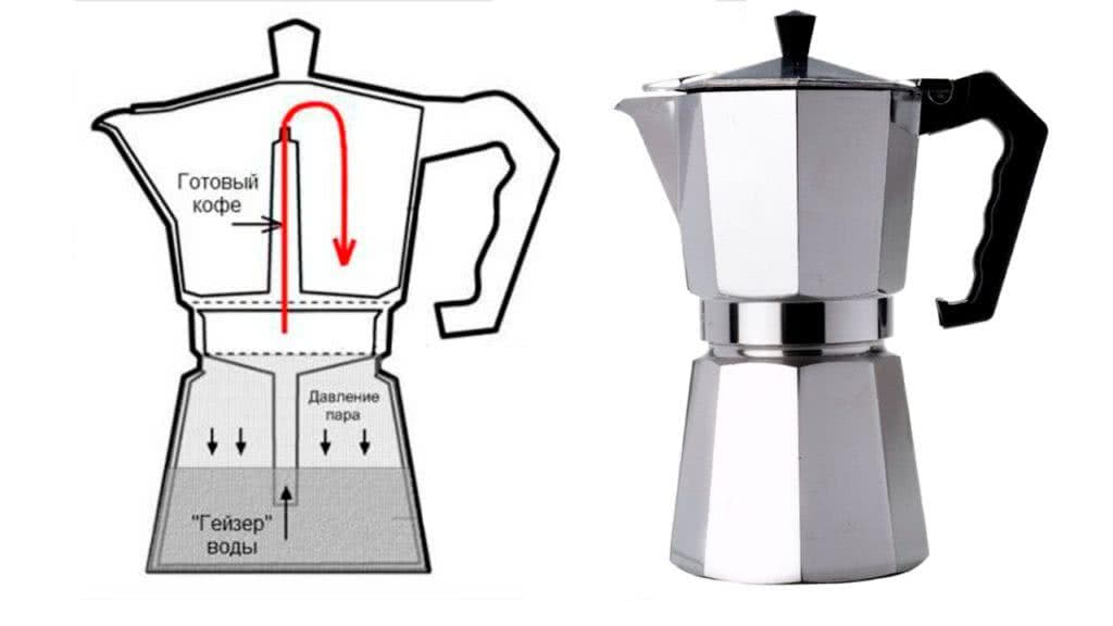 Процесс происходит при нагревании жидкости, где образующийся пар поднимается вверх и проникает в фильтр где проходит сквозь кофейный порошок. И тонкая струя стекает в кружку.