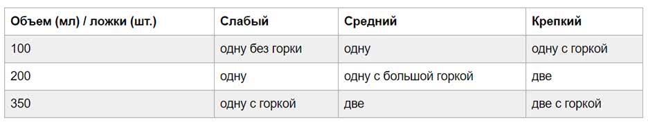 А вот, сколько взять кофейных зерен – это будет уже зависеть от крепости готовящегося напитка, а не только от личных предпочтений. Для компании из нескольких человек оптимальным будет соотношение: 5 столовых ложек кофе на 1 литр воды. Если рассчитывать на одну порцию, то правильным сочетанием будет 1-2 десертных ложки на 150-170 мл воды. Для приготовления крепкого насыщенного напитка берут 3-4 чайных ложки кофе на 100 мл воды.