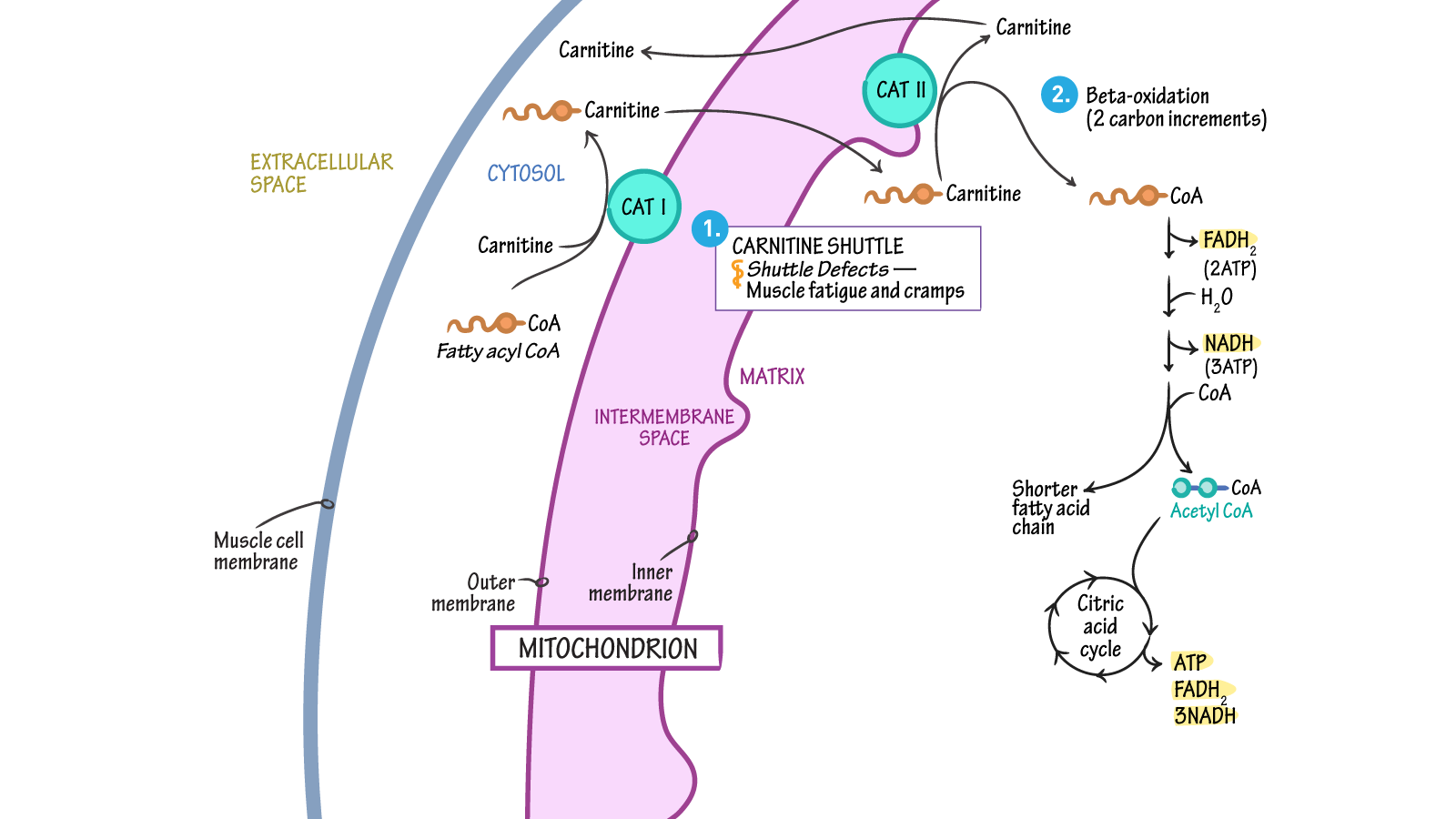 Но жирные кислоты не могут достичь митохондрий самостоятельно. для этого они используют так называемый «карнитиновый челнок», который позволяет им проникнуть в «энергетические станции». Карнитин цепляется за длинные цепочки жирных кислот, перенося их в митохондрии, где эти вещества преобразуются в энергию. Таким образом обеспечивается энергообеспечение и поддержание жизнедеятельности всего организма.