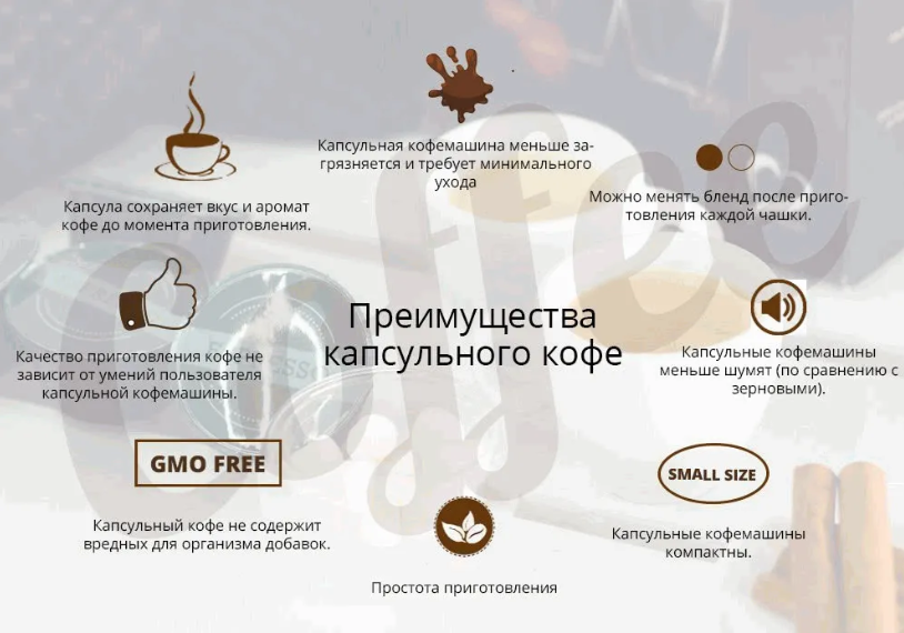 Кофе, помещенный в капсулы, получается из тех же зерен, которые используются сразу же после перемалывания. Он закупорен герметично и обладает своими достоинствами: