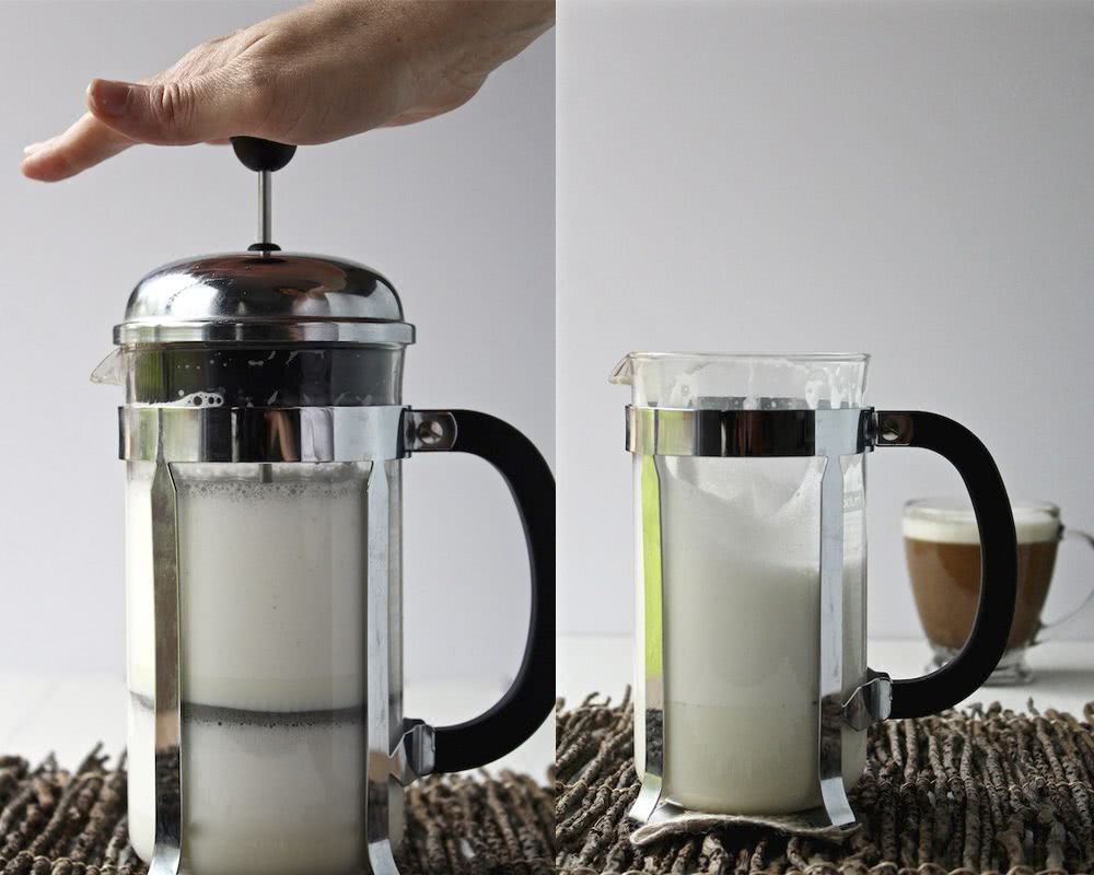 Френч-пресс также может стать для вас самодельным ручным пеновзбивателем. Подогретое молоко нужно залить внутрь чаши френч-пресса. Объем молока не должен превышать треть сосуда. Затем следует энергично двигать поршень устройства вверх-вниз.