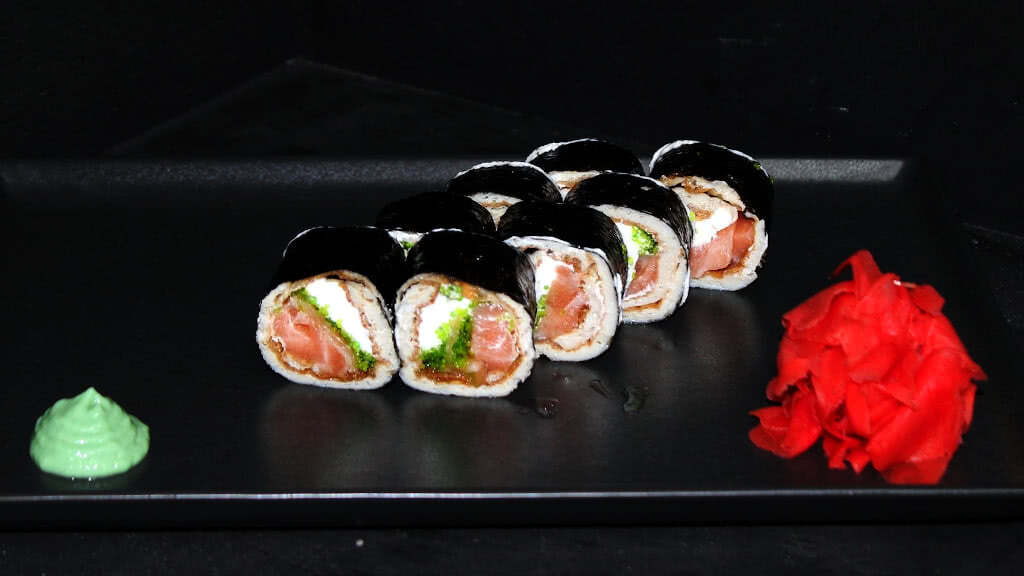 - На нори нанести начинку из цветной капусты с сыром и соусом. На противоположный край нори выложить начинку из лосося, авокадо или огурца. Туго свернуть. Разрезать ролл на равные части.