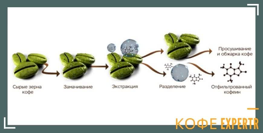 Не обжаренные зеленые зерна вымачивают в воде, впитывающей в себя не только кофеин, но и ароматические масла. На следующем этапе эта вода отфильтровывается от алкалоидов, а зерна возвращают в ароматизированную жидкость и повторяют процесс до тех пор, пока концентрация алкалоидов не достигнет минимума.