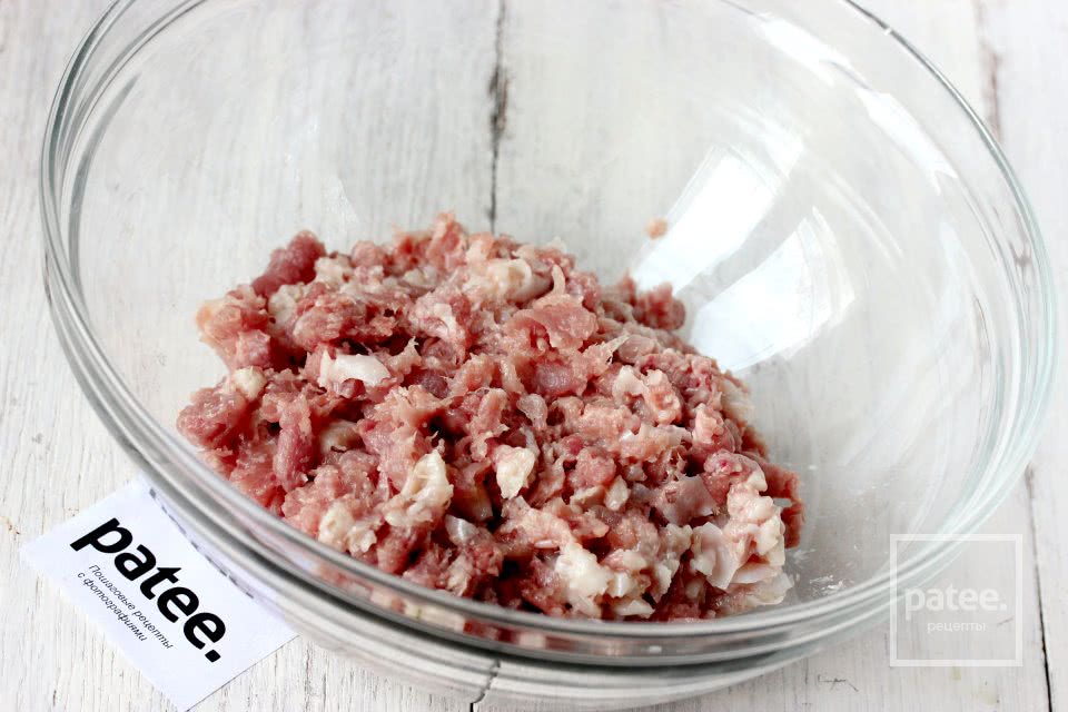 Кожу и мелкие кусочки индюшиного мяса пропускаем через мясорубку с крупной решёткой (примерно 300 грамм).