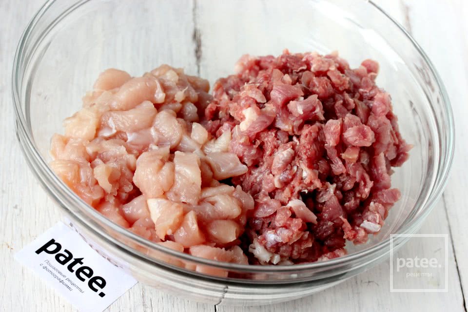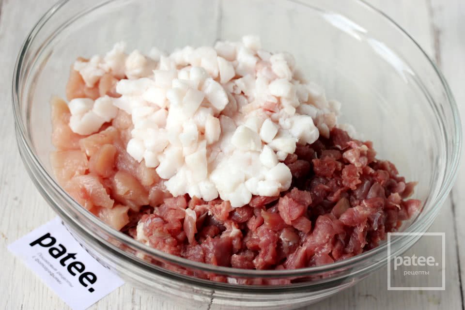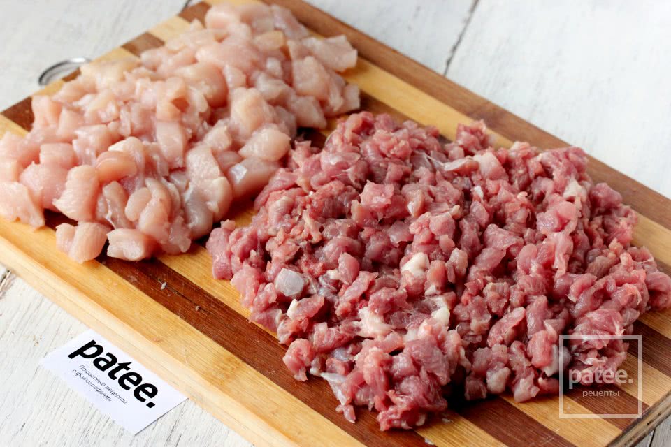 Добавляем к индюшиному мясу, перекрученному через мясорубку, кубики нарезанного мяса курицы и индейки.