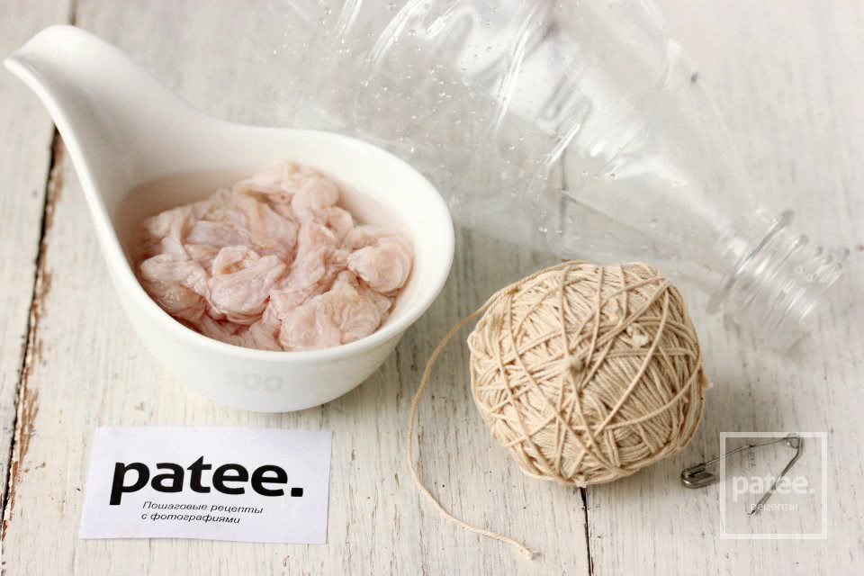 Подготовим очищенные и вымоченные в воде с уксусом свиные кишки, толстую нитку, обрезанное горлышко с бутылки и булавку или иголку (для прокалывания колбасы).