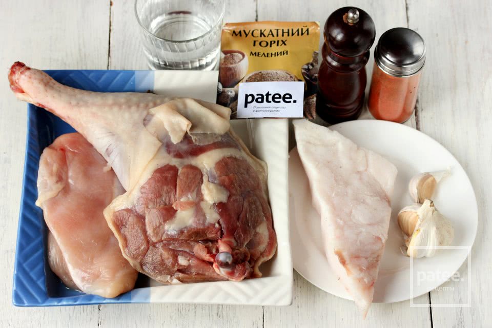 Для приготовления домашней индюшино-куриной колбасы нам понадобятся следующие ингредиенты: индюшиная голень, куриное филе, сало свежее, чеснок, соль, чёрный молотый перец, молотый мускатный орех, молотая паприка, ледяная вода.