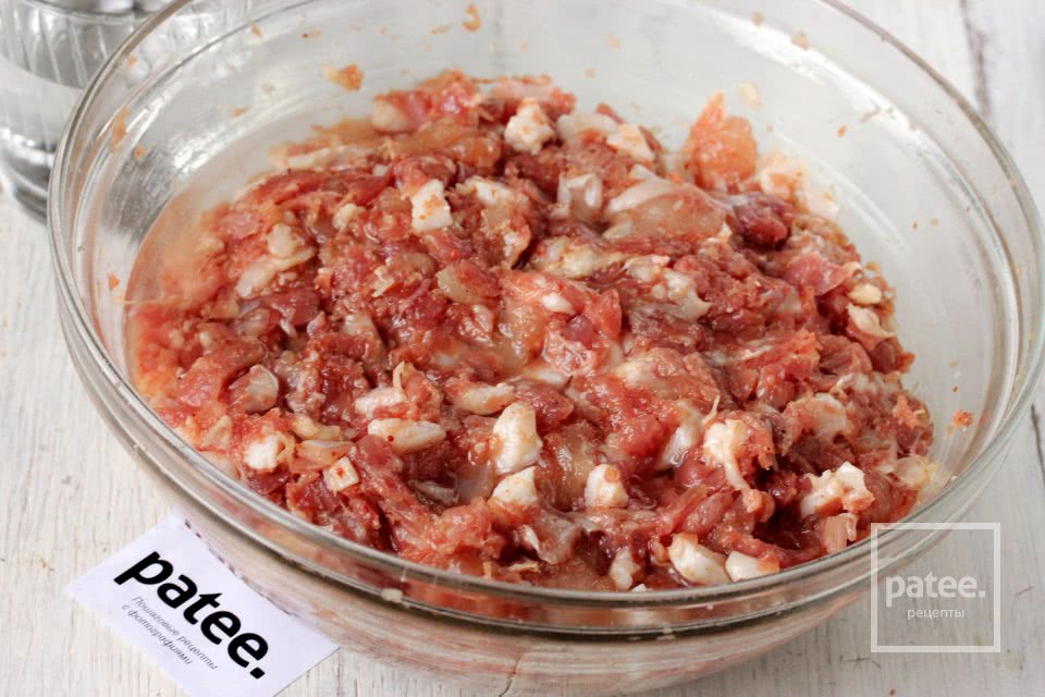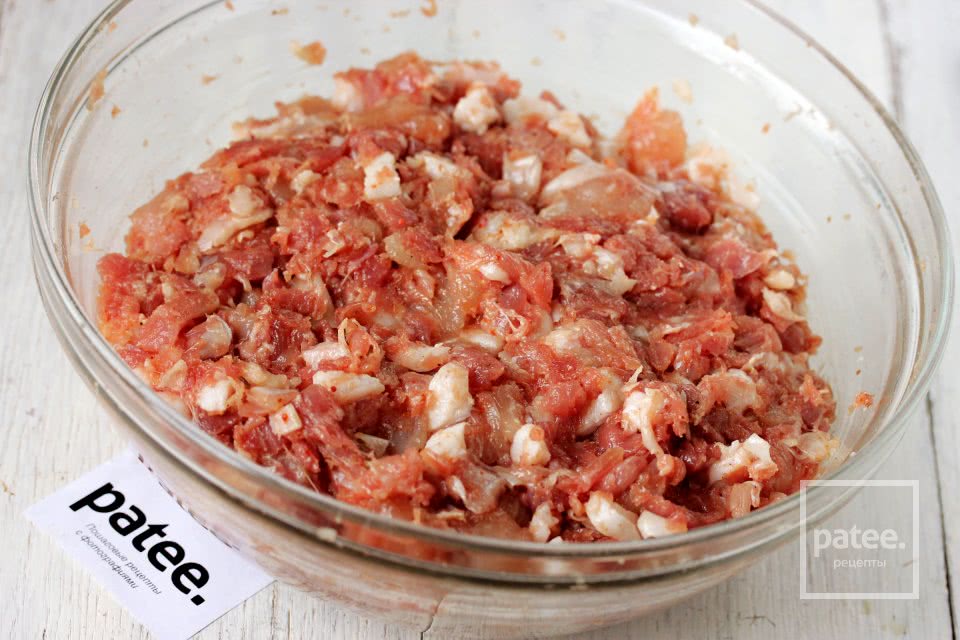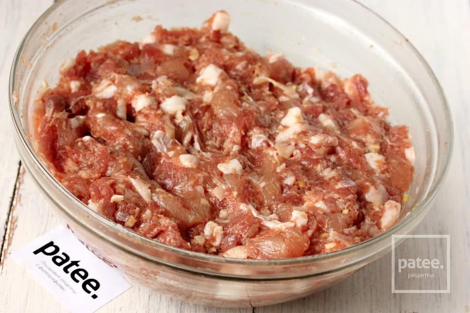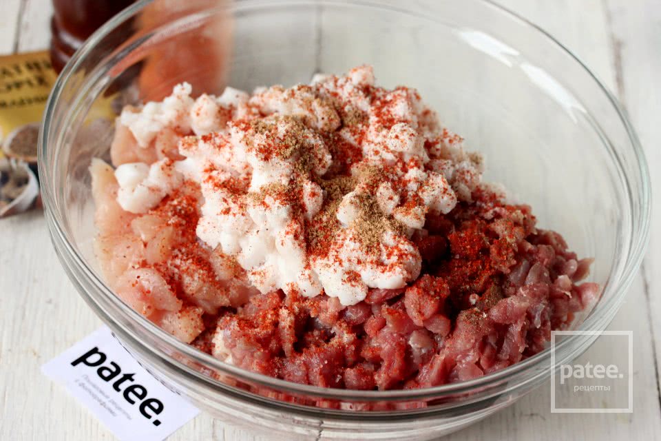Тщательно перемешать смесь до однородности. Для большего раскрытия вкуса к фаршу можно добавить такие специи, как кардамон, кориандр или паприку, они прекрасно подчёркивают мясной вкус и придают блюду особый аромат.
