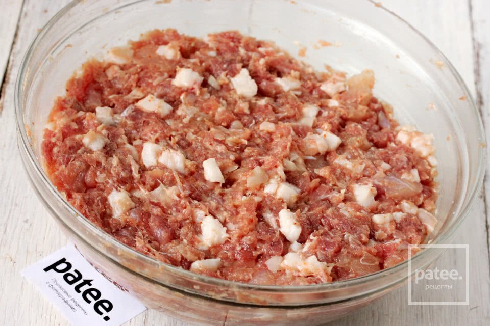 Мясо режем маленькими кусочками, толщиной в 1 см, сало мелем на мясорубке.