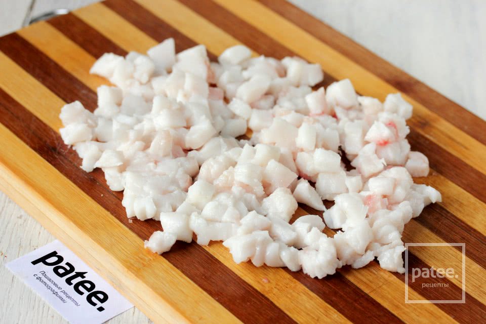 С сала снимаем кожу и нарезаем его мелкими кубиками такого же размера, как и мясо.