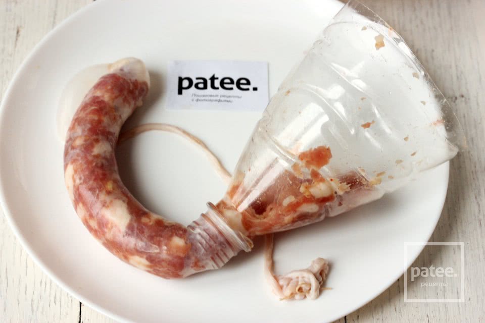 Берем специальную трубочку для набивания кишок, если нет у вас такого конуса, можно воспользоваться пластиковой бутылкой, отрезав её на 10-15 см от горлышка.