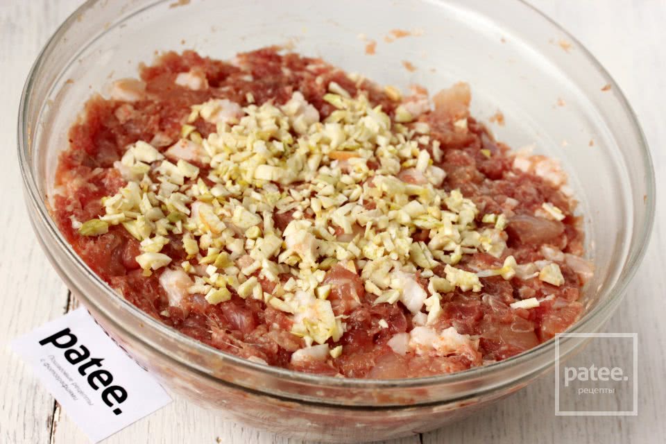Чеснок чистим и измельчаем. Добавляем чеснок в мясной фарш.