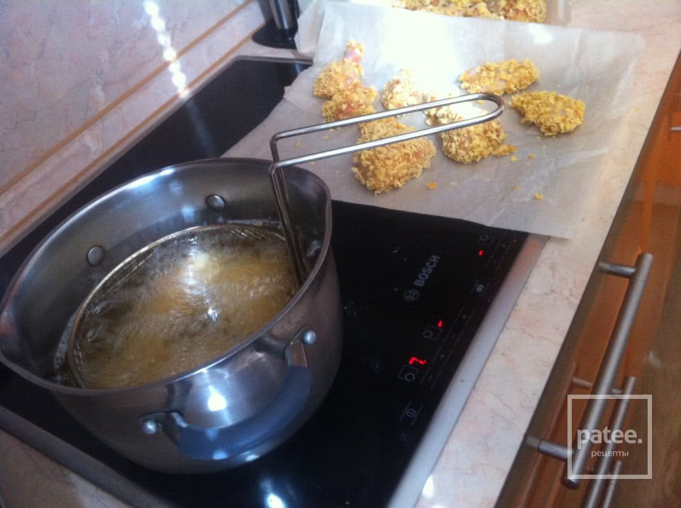Емкость наполняют растительным маслом, в котором куриная нарезка должна плавать. Фритюрницу подогревают, чтобы шел легкий дымок. Туда кладут 5 кусков, жарят их примерно 10 минут.