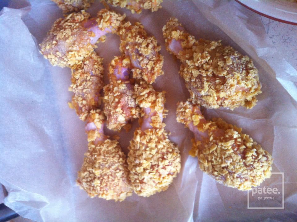 - Куриные крылья необходимо обмакнуть в смесь приправ, а затем обвалять в измельченных кукурузных хлопьях, добавляя при необходимости яичную смесь.