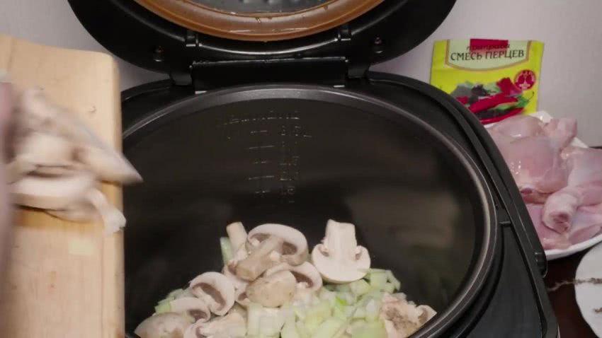Небольшие очищенные шампиньоны нарезаем пластинками. Добавляем в мультиварочную чашу, где тушатся лук с курицей.