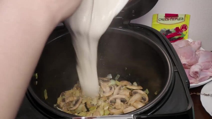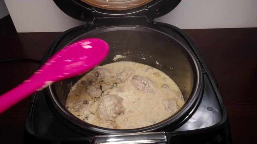 По прошествии времени добавляем сметанный соус с мукой, перемешиваем все ингредиенты и даем мультиварке еще потушить курицу с грибами около 4-х минут.