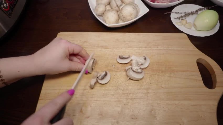 Грибы порезать пластинами, достаточно толстыми. Если у вас шампиньоны средних размеров, рекомендуемая толщина пластины — 3–5 мм.