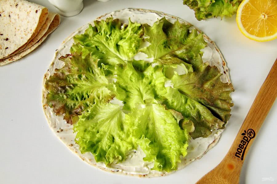 Смажьте лаваш сливочным сыром и разложите на нем листья салата. Салат предварительно необходимо промыть и обсушить.