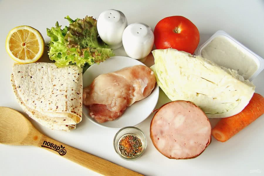 Начинку можно разнообразить любыми овощами по вкусу. Я для сочности предлагаю добавить спелые помидоры и хрустящую капусту. Так же для более яркого вкуса добавим обжаренное куриное филе, которое предварительно замаринуем в лимонном соке и специях. Получится очень вкусная и сытная закуска, которая подойдет и для домашних посиделок и для выезда на пикник. Количество ингредиентов указано из расчета на 1 большой лаваш или два средних. По желанию пропорции смело уменьшайте или увеличивайте исходя из ожидаемого количества едоков.
