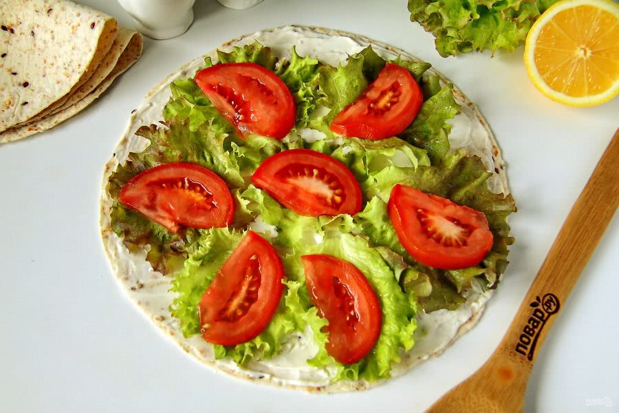 - Затем снова накрыть другим лавашом, намазать сыром, выложить пластинки помидоров, на помидоры майонез с чесноком. Иногда я не закрываю вторым лавашом, а сворачиваю сразу один лаваш с начинкой.