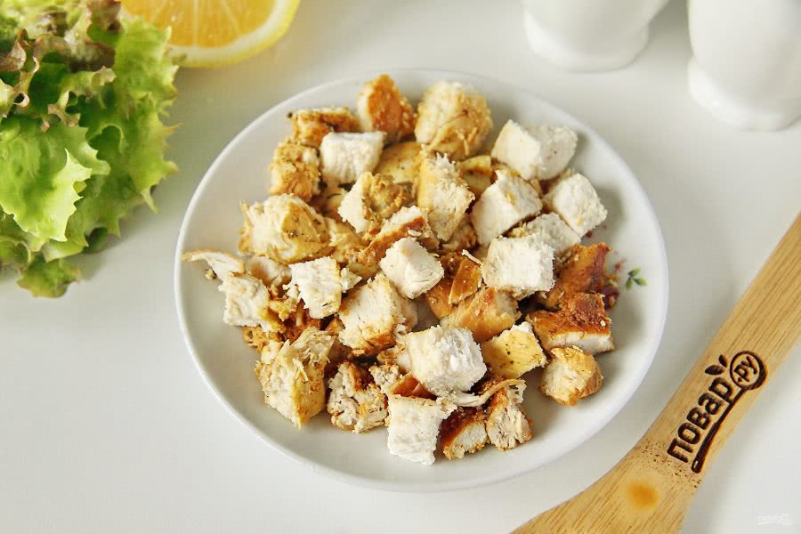 Куриное филе натрите солью и специями, полейте лимонным соком и оставьте мариноваться на 20 минут. Затем обжарьте с двух сторон в сковороде прикрыв крышкой на умеренном огне до готовности, после чего нарежьте кубиками.