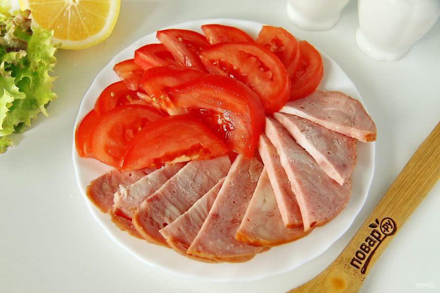 Ветчину и помидоры нарежьте тонкими кружочками, затем каждый кружок еще на две части.