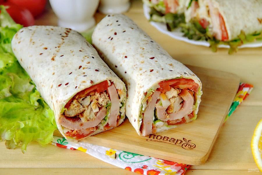 Рулет из лаваша с ломтиками ветчины и помидорами
