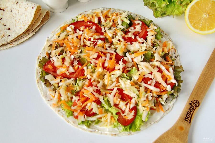 - Разворачиваем лаваш, распределяем по нему начинку равномерным слоем;