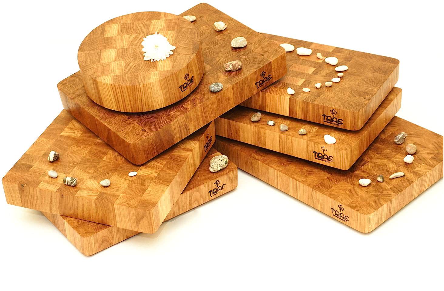 - Производители этих товаров используют только прочные сорта древесины, которые не раскалываются при падении. В отличие от обычных досок, часто склеенных из тонких дощечек, при разделке или шинковке от поверхности не летят мелкие щепки. Можно быть уверенным, что в пищу они не попадут.