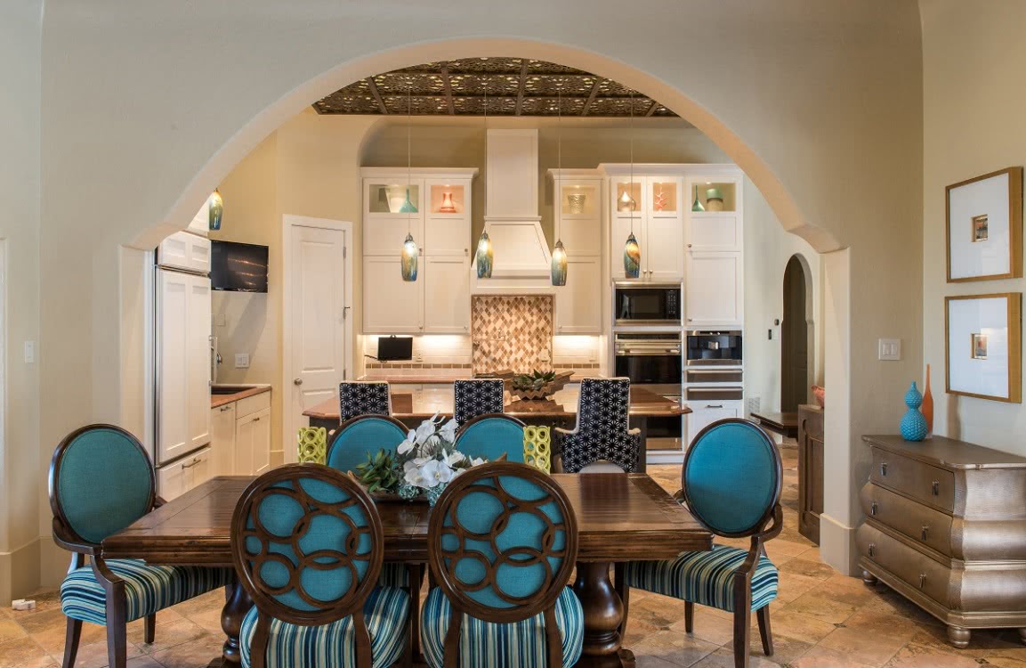 Марокканские кухни можно украсить с помощью ковров. Идеально, если удастся подыскать изделие, узоры которого идентичны или перекликаются с орнаментами на стенах или фартуке. Практичные хлопковые салфетки украшают пестрой вышивкой в восточном стиле, не ограничиваясь в выборе расцветки принтов.
