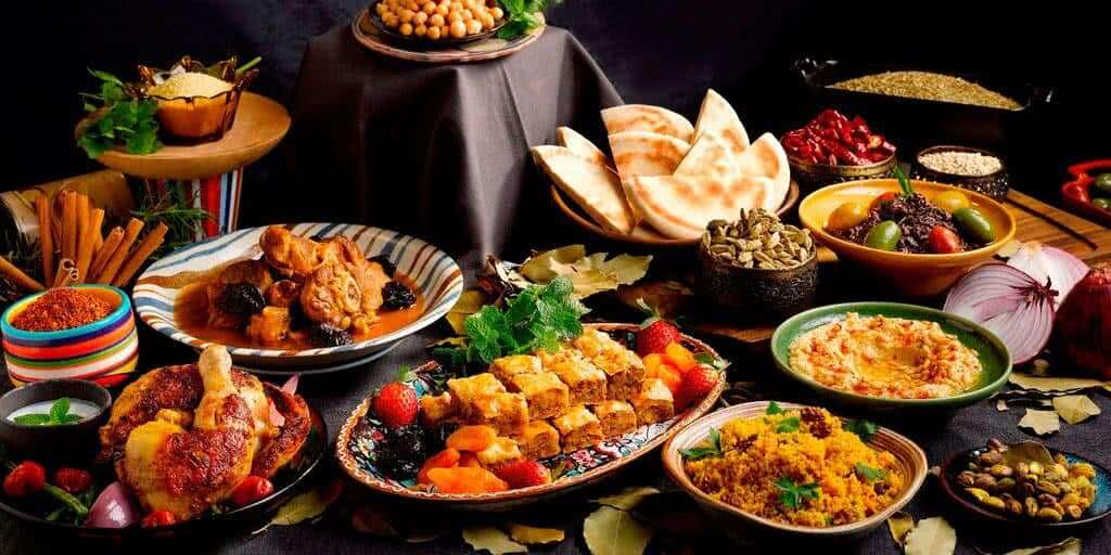 Одним из самых популярных национальных блюд является баранина, которую могут готовить на открытом огне, отваривать и подавать с бульоном или запекать с финиками, черносливом и другими сушеными фруктами. На каждый праздник принято накрывать богатый стол, от обилия угощений может растеряться даже большой знаток местной кулинарии