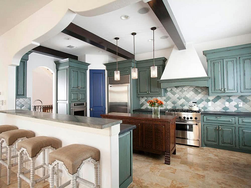 Деревянные балки – отличный способ декорировать кухню в марокканском стиле. Особенно хорошо такие перекрытия будут смотреться на фоне белоснежного потолка. Если высота помещения позволяет, деревянные конструкции дополнительно украшают ветвями эвкалипта или олеандра. Низкий потолок можно просто покрасить в тон, гармонирующий с отделкой стен.