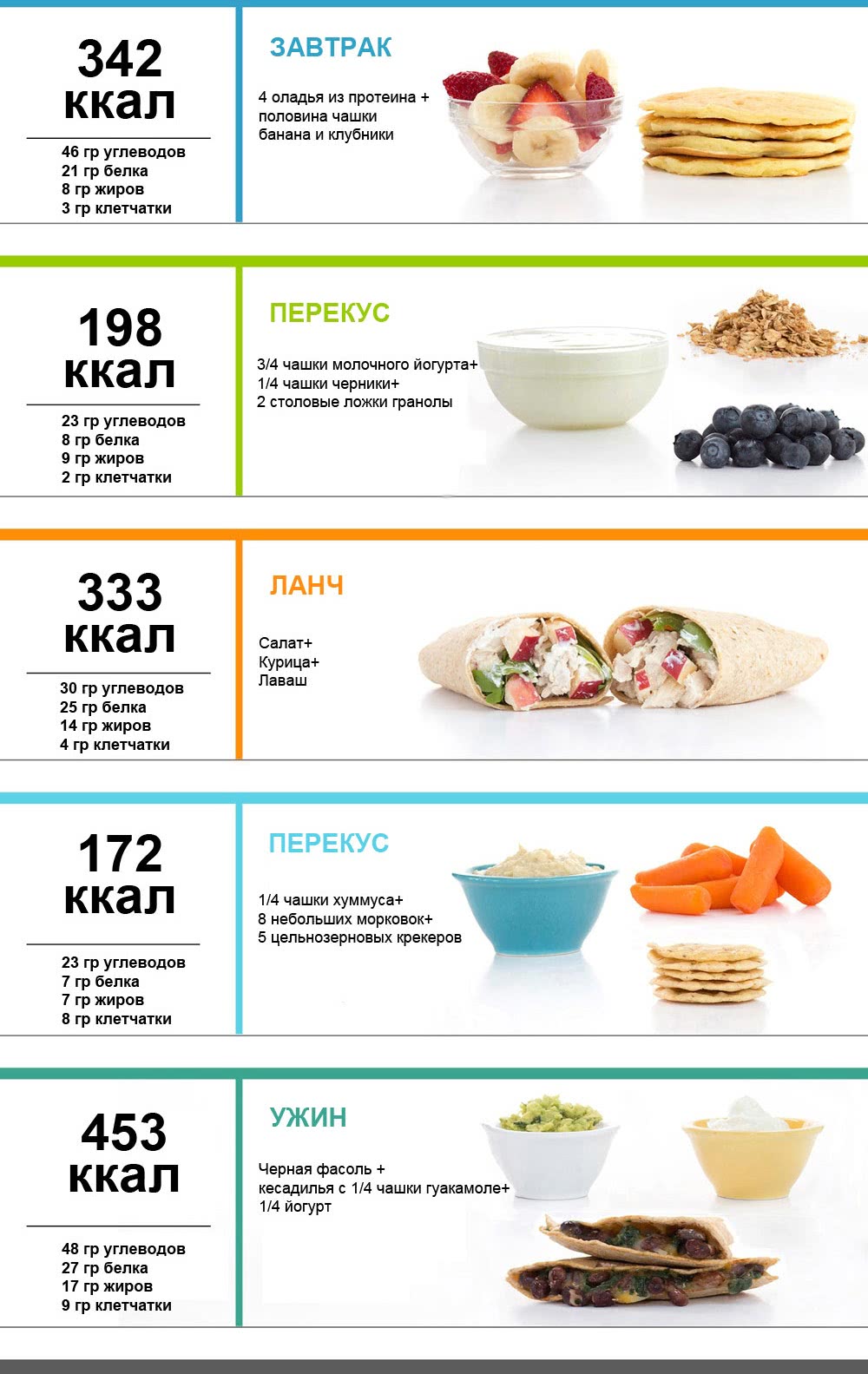 | Чт | Куриные паровые котлеты 100 г., морковь тушеная 100 г., кофе с молоком без сахара 100 мл. | Салат из свежей капусты 150 г. | Вегетарианские зеленые щи 250 г., мясо отварное 90 г., горошек зеленый 90 г., яблоко свежее 100 г. | Киви 2 шт. | Рыбное филе паровое 100 г., овощное рагу 150 г. | Кефир 200 мл. |