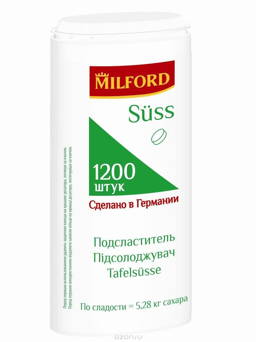 Заменитель сахара немецкого производства Milford Suss выпускается в форме таблеток и жидком виде. Если таблетки можно встретить у многих производителей, то жидкий сахарозаменитель выпускают не все фирмы.