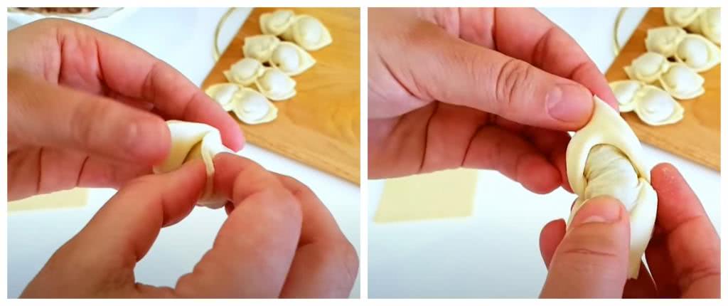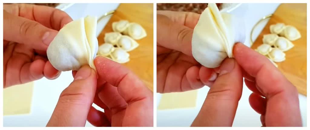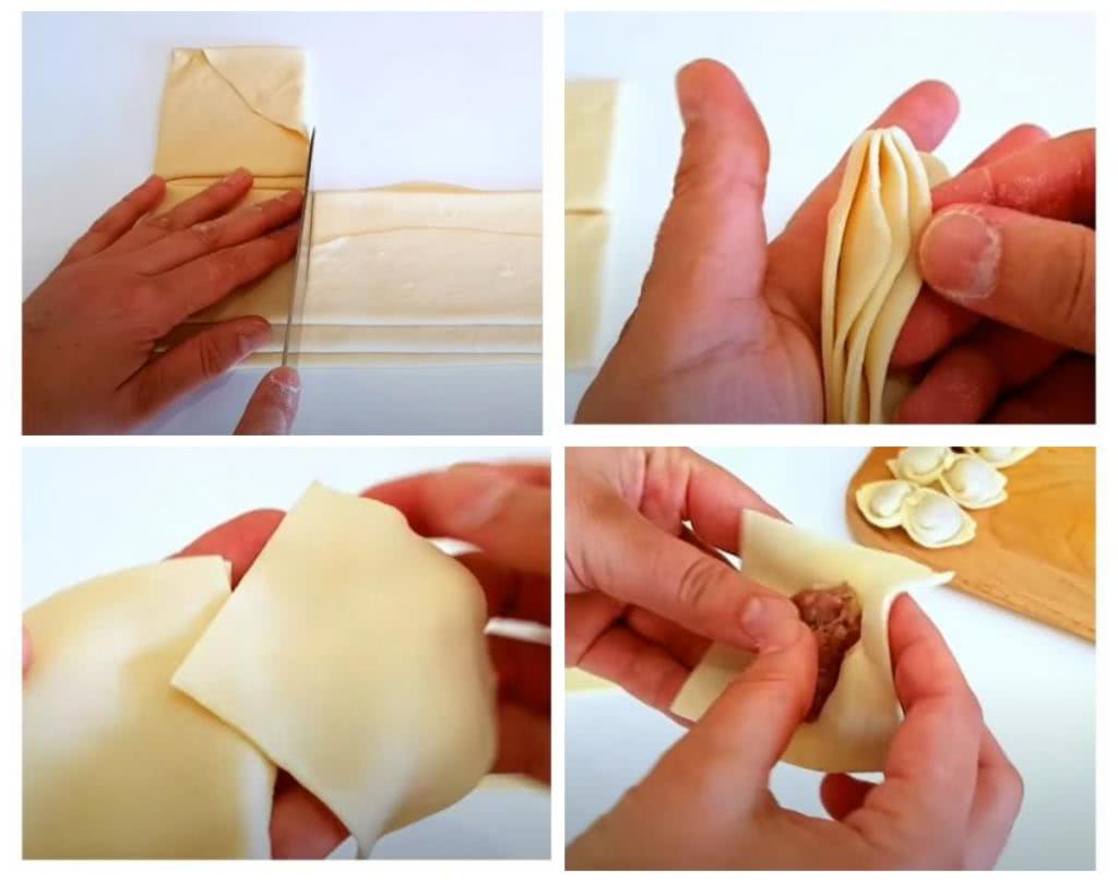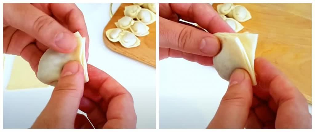 На каждый квадрат положить фарш, слегка смочить края теста водой. Загнуть тесто на фарш, прищипнуть края. Затем согнуть пополам, соединив края. Два противоположных уголка соединить, загнув их вниз. Средний уголок развернуть. Наглядно процесс формирования пельменей представлен на фото ниже.