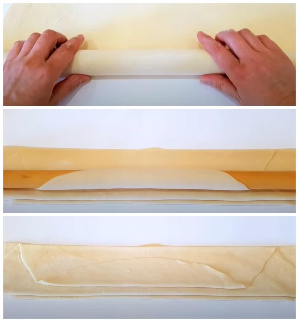 Посыпать на стол муку, обвалять в ней шарик теста и размять рукой до круглой лепешки. Затем раскатывать скалкой, наматывая тесто на нее, до тонкого пласта.
