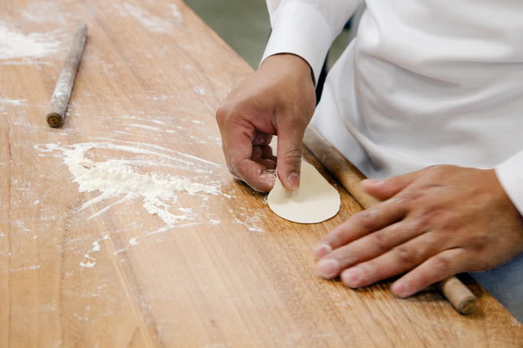 Нужно постараться использовать как можно меньшее количество муки. Это отобразится на нежности блюда и на том, насколько легко будет слепить пельмени. Толщина теста должна быть не менее 2 мм, а сам пласт нужно раскатывать небольшим. Лучше всего раскатывать тесто маленькими порциями по мере лепки пельменей.
