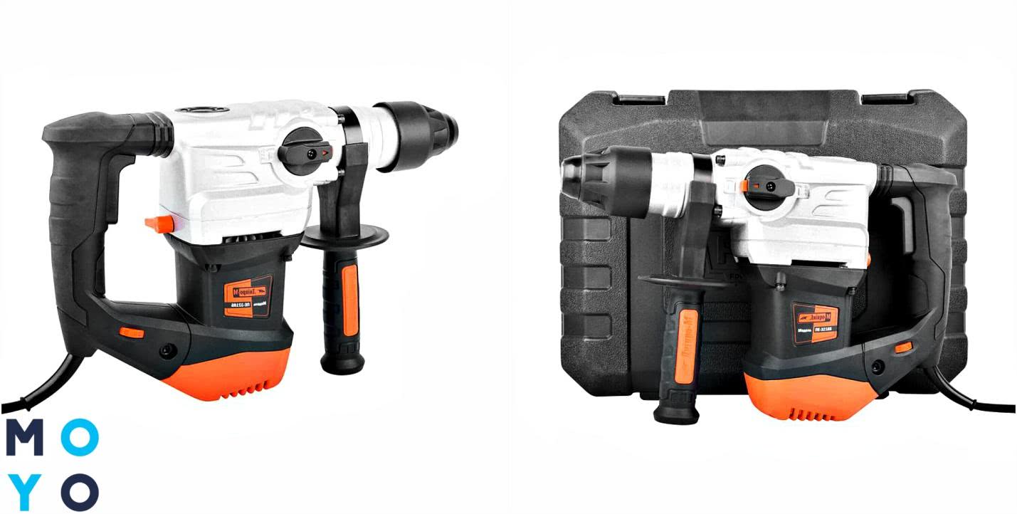 Верхняя часть корпуса аппарата изготовлена из металла, благодаря чему орудие стойко переносит всевозможные виды повреждений (царапины, сколы). За надежный хват пользователя отвечает рукоятка с прорезиненным покрытием. Переключатели находятся под рукой, можно пользоваться ими в процессе сверления. Патрон здесь SDS +, прибор можно использовать с бурами Ø до 15 мм. Однако при этом аппарат довольно увесист (5,2 кг). Модель ориентирована на использование в профессиональных целях.
