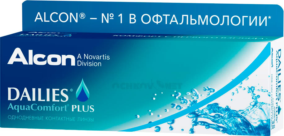 - Dailies AquaComfort Plus (Alcon) — асферические офтальмологические изделия с высоким показателем влагосодержания — 69%. Эта модель пойдет даже при склонности роговицы к сухости.