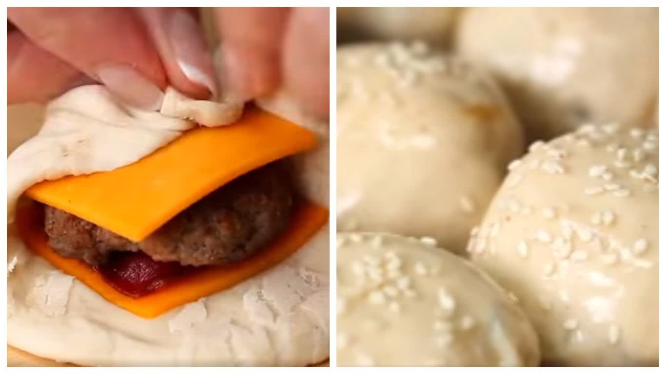 Рецепт. Из шариков теста сделайте лепешки. На каждую уложите тонкий ломтик сыра и маленькую котлету. Заверните. Сформируйте полуфабрикат пирожка. На противень уложите швом вниз. Смажьте взбитым яйцом. Посыпьте кунжутом. В духовке пеките до готовности. При температуре 220℃ уйдет около 40 минут.