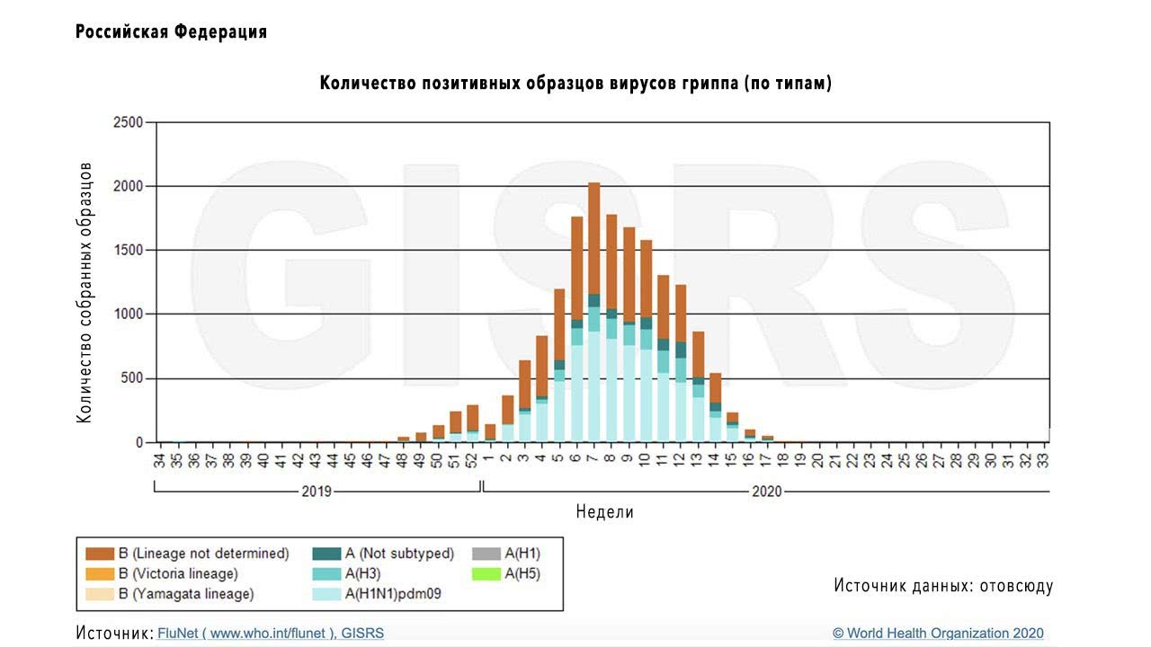 Рисунок 1. Количество образцов разных штаммов вирусов гриппа А и В, собранных в России в 2019-2020 гг. Источник