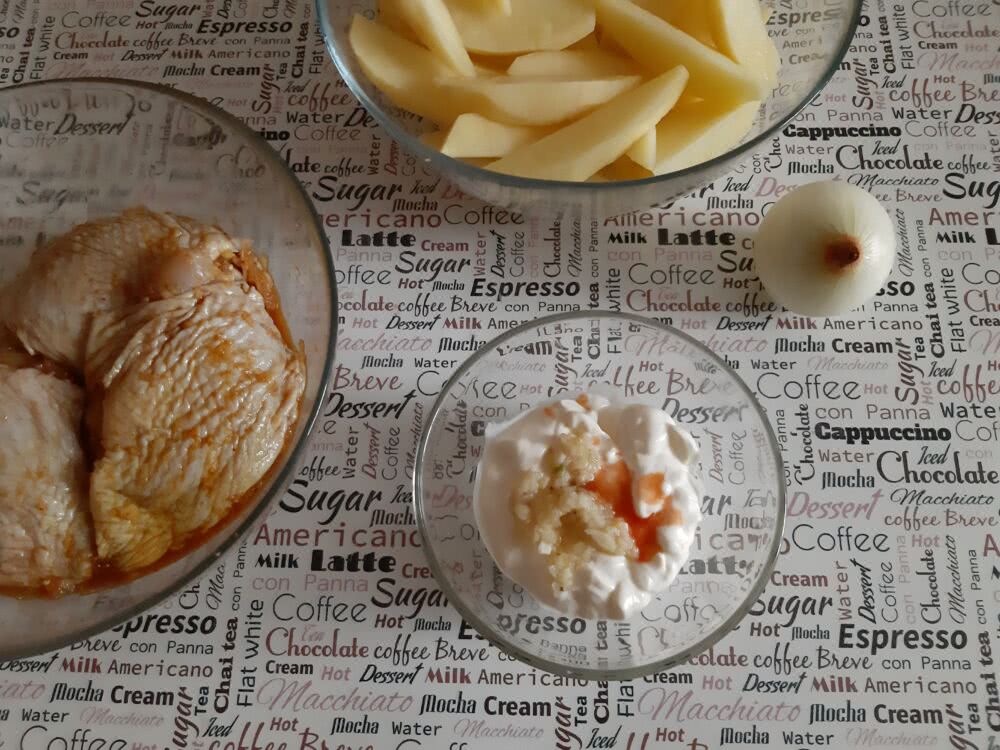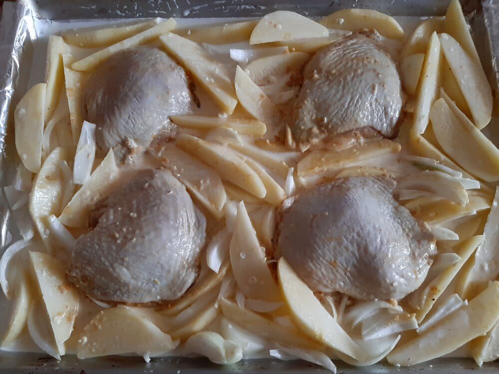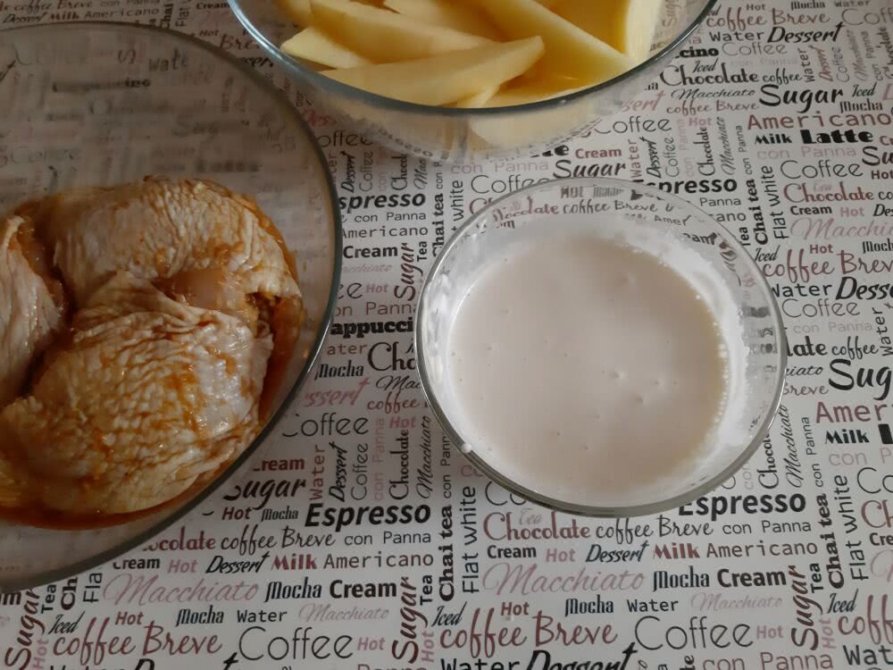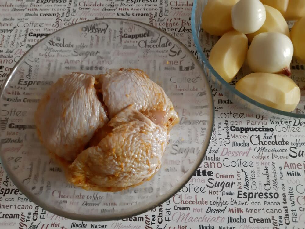 - После того, как картошка будет готова к запеканию, необходимо промыть и просушить куриные окорока, а затем выложить их на 30 мин. в маринад, в состав которого входят майонез, специи, куркума, паприка.