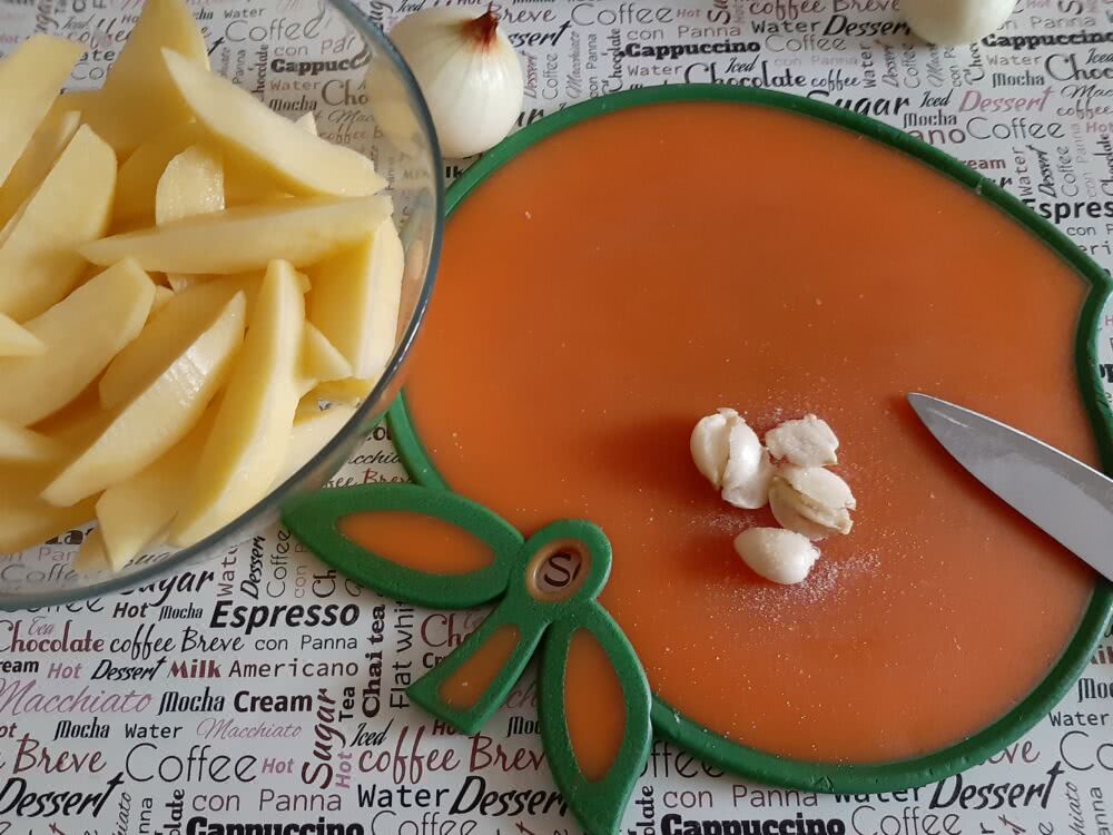 Шаг 4. Очищенный картофель нарезаем длинными ломтиками, лук перышками. Чеснок растираем в пасту.