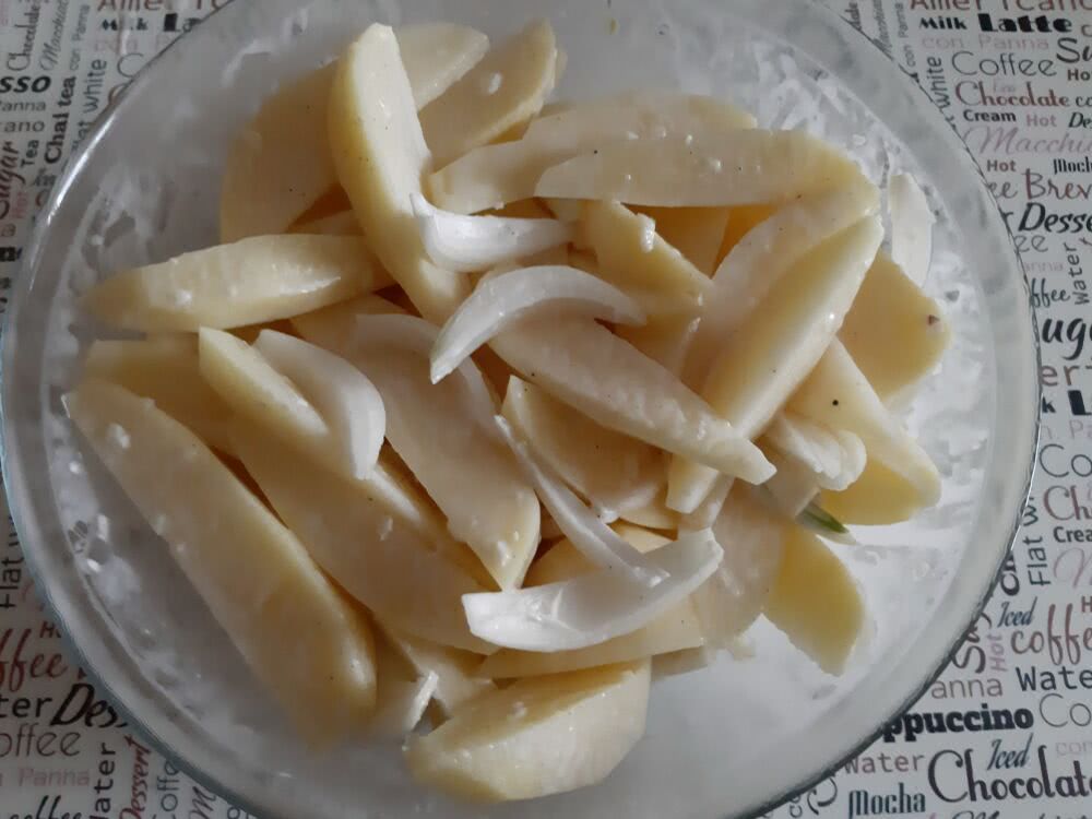 - Картофельные дольки затем следует выложить на предварительно смазанный растительным маслом противень.
