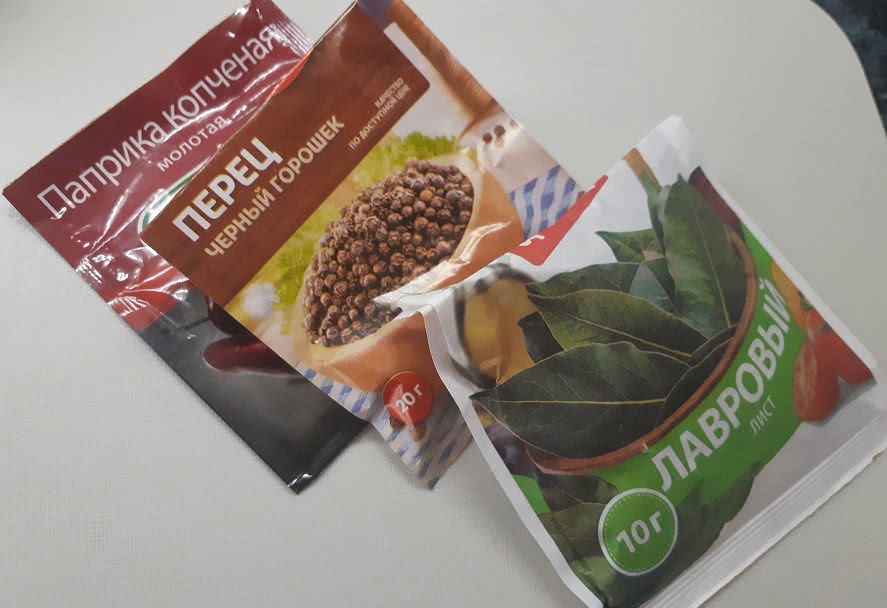 - Черный перец горошком, лавровый лист, паприка