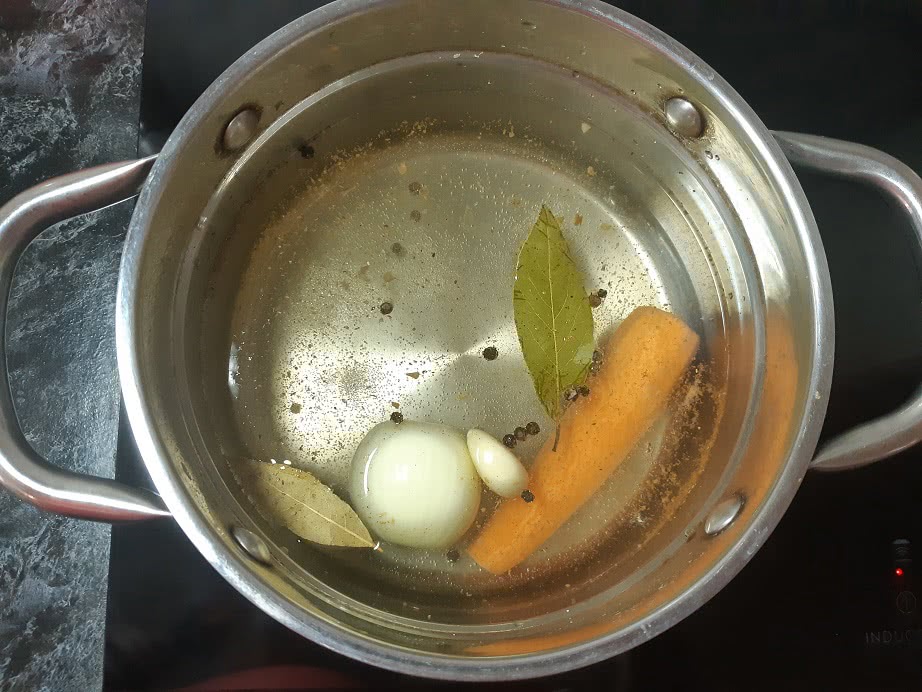 Лук, чеснок, морковь, перец и лавровый лист кладем в кастрюлю и заливаем достаточным количеством воды. Если вы купили целиковую тушку или мясо на кости, то отделяем филе и кладем кость в кастрюлю.