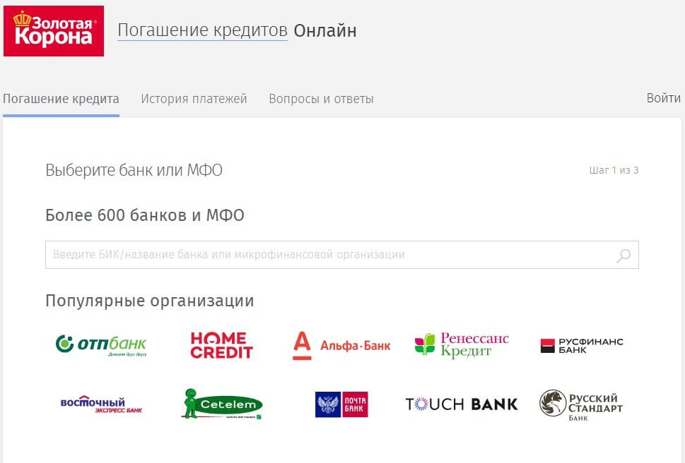 Если предыдущие методы оплатить кредита через интернет не подходят, Золотая Корона вам в помощь. Откройте koronapay.com. Перейдя на «Погашение кредитов», жмите «Оплатить онлайн».