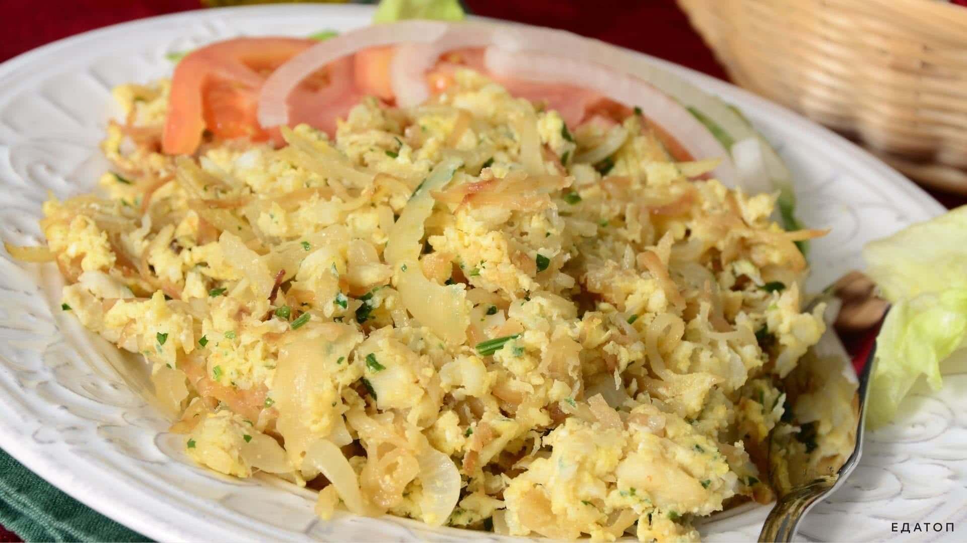 Вареную треску добавляют к жареному картофелю, луку, яйцам и маслинам – после чего еще немного тушат.
