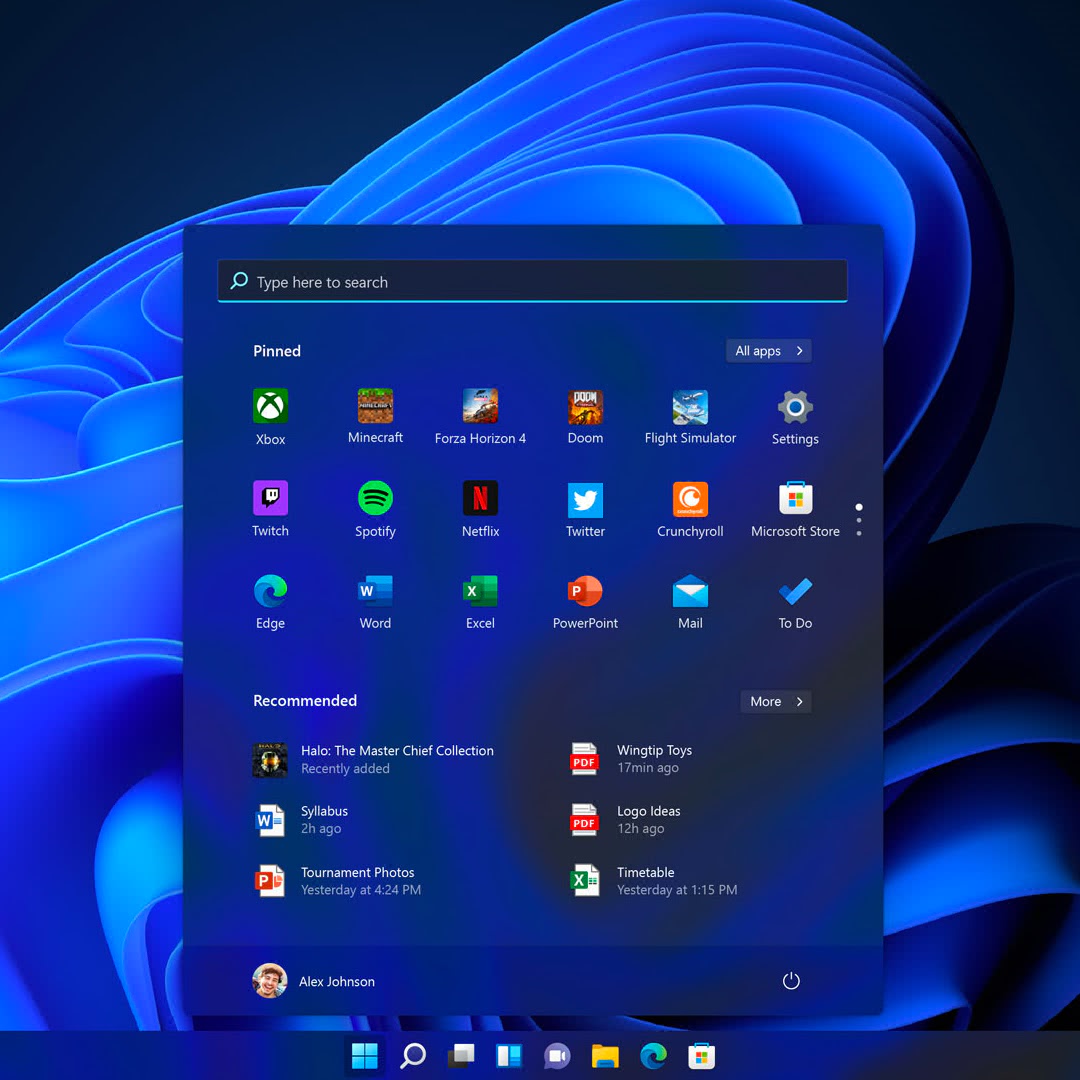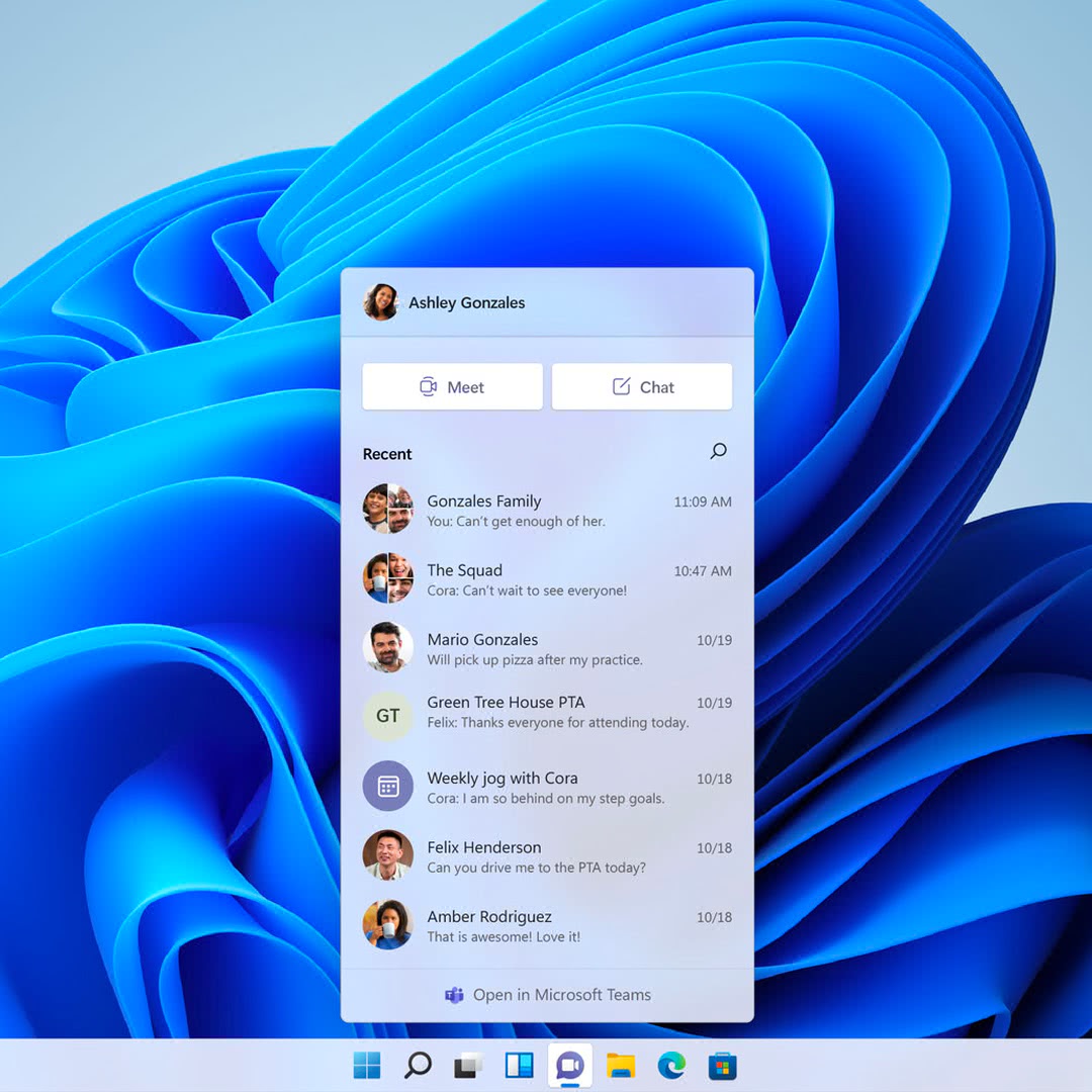 Обновленная панель задач группирует значки посередине, как в Chrome OS и некоторых современных вариантах Linux. По умолчанию там, кроме кнопки «Пуск», выводится значки поиска, панели виджетов, меню многозадачности, и чатов в Teams. Четыре последних при желании можно отключить. Teams в Windows 11 интегрирован «из коробки» и может использоваться как для корпоративных коммуникаций, так и, бесплатно, для личного общения.