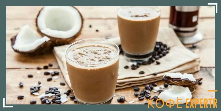 Рецепт для ценителей конфет раффаэлло, вкуса кокоса. Вместо сливок используется кокосовое молоко (объем — 150 мл). Затем ингредиенты перемешиваются, взбиваются. Сверху напиток посыпается кокосовой стружкой.